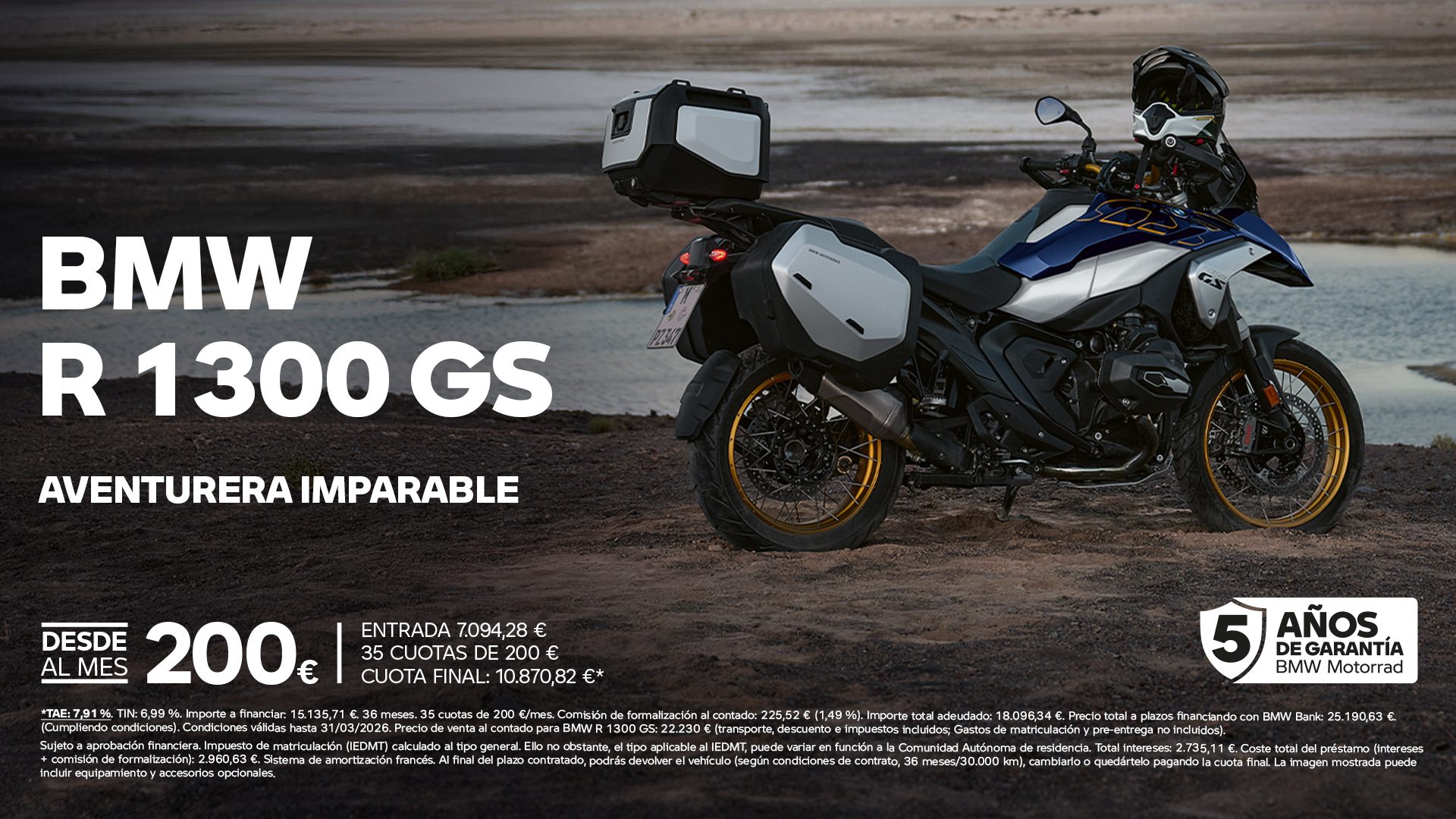 *TAE: 7,91%. TIN: 6,99%. Importe a financiar: 15.135,71€. 36 meses. 35 cuotas de 200 €/mes. Comisión de formalización al contado: 225,52€,1,49%” Importe total adeudado: 18.096,34 €. Precio total a plazos financiando con BMW Bank: 25.190,63 €.(Cumpliendo condiciones). Condiciones válidas hasta 31/03/2026. Precio de venta al contado para BMW R 1300 GS: 22.230,00 €.”(transporte, descuento e impuestos incluidos; Gastos de matriculación y pre-entrega no incluidos).